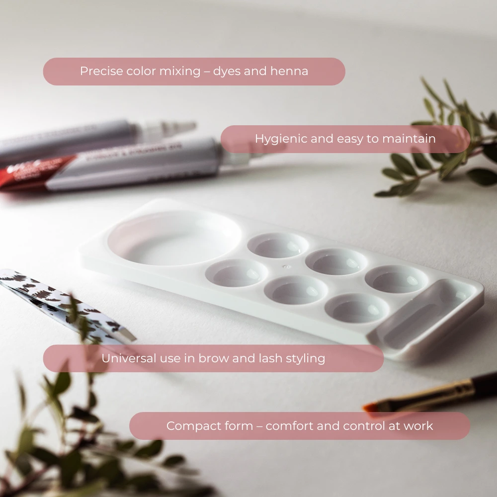 The ergonomic shape of the palette ensures comfortable mixing of cosmetics, and its small size provides full control over each product. With this palette, creating custom shades that perfectly match your client's needs becomes easy and fast. It helps achieve a professional and precise result in every brow or lash styling.